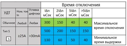 Решением в даном случае будет установить на вводе УЗО с выдержкой времени на срабатывание, так называемое селективное УЗО. Этот тип устройств имеет индекс «S» (от англ. Selectivity – селективность) и в случае повреждения отключается с задержкой до 130 миллисекунд (полное время отключения может быть до 0,5 сек в зависимости от величины дифф. тока см таблицу 1). Такие УЗО с недавнего времени представлены в линейке Easy 9, производимой Schneider Electric.
